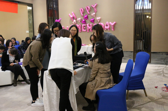 活出更精彩美丽的自己,什么时候开始都不算晚。“鼎峰·三月丽人行——有爱3.8,您的形象价值百万”日常妆容技巧讲座13:30分准时在鼎峰馆开讲,现场座无虚席。主讲乔维维老师以幽默风趣的语言,以PPT+现场实操互动的方式,就日常化妆程序及注意事项进行了生动形象的讲解,而有关于护肤的小技巧更是令女神们获益匪浅。