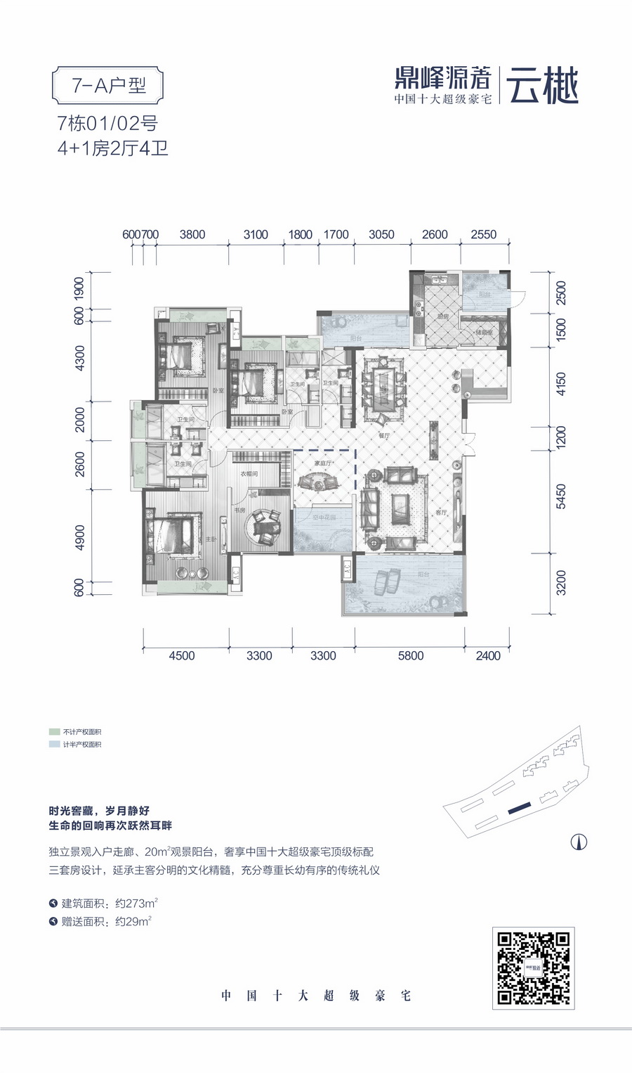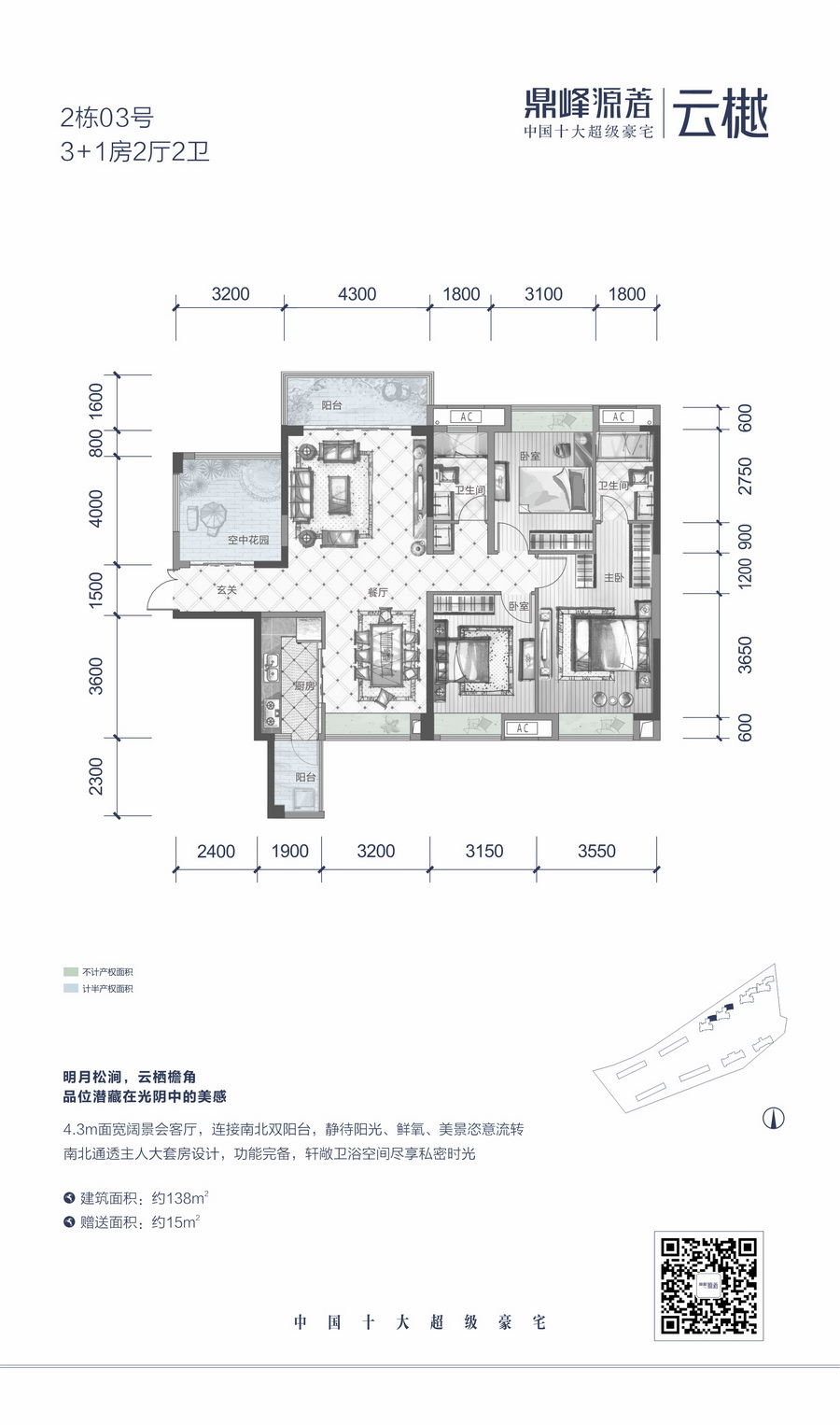 生长在7000亩植物园的房子!园区植被覆盖率高达80%,充溢1000个/cm ³负氧离子,空气清洁度A级,构建南中国城央生态山水“城中有山、山中有水、水边有人家”的理想人居环境。2014、2015年蝉联“中国十大超级豪宅”,比肩全国一线顶尖豪宅。