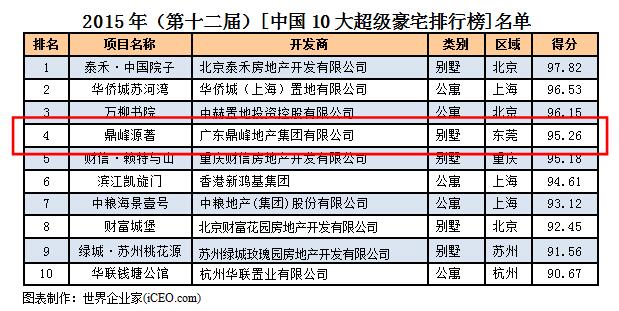 3月26日,世界企业家集团、世界地产研究院和《总裁》杂志联合编制的2015年(第十二届)《中国10大超级豪宅》排行榜在北京隆重发布。北京泰禾中国院子、上海华侨城苏河湾、北京万柳书院、东莞鼎峰源著、重庆财信·赖特与山名列前五。