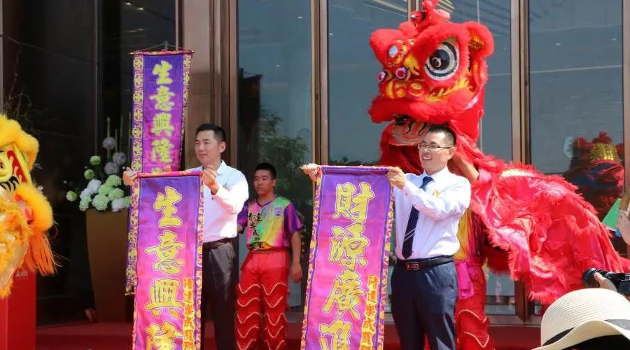 随着鼓乐声响起,营销中心现场成为一片欢腾的海洋。雄狮跃身摘下营销中心正门上悬挂的生菜,领导接财聚宝,寓意遍地生财。
