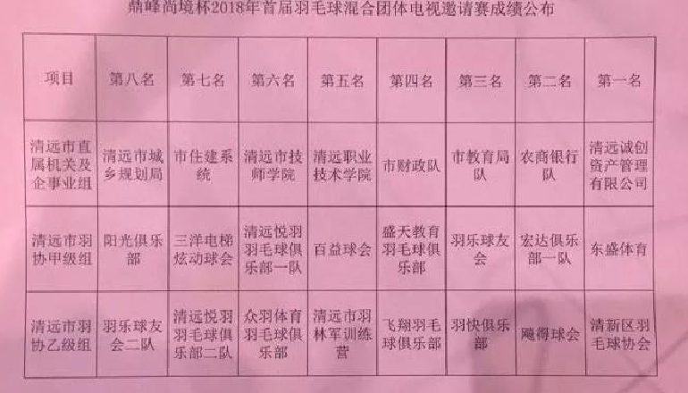 一连两天的激烈角逐,39支队伍用精湛的球技、拼搏的精神,呈现了一场精彩的羽毛球比赛,最后,清远市诚创资产管理有限公司、东盛体育、清新区羽毛球协会,过五关斩六将,分别获得市直属机关及企事业混合团体组、市羽协甲级混合团体组、市羽协乙级混合团体组组别的冠军,各个组别具体的名次如下: