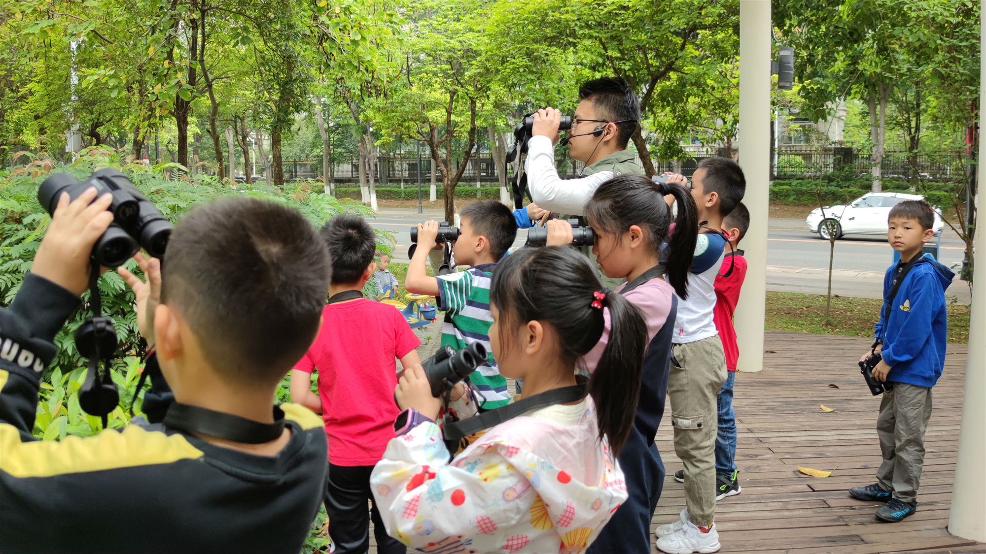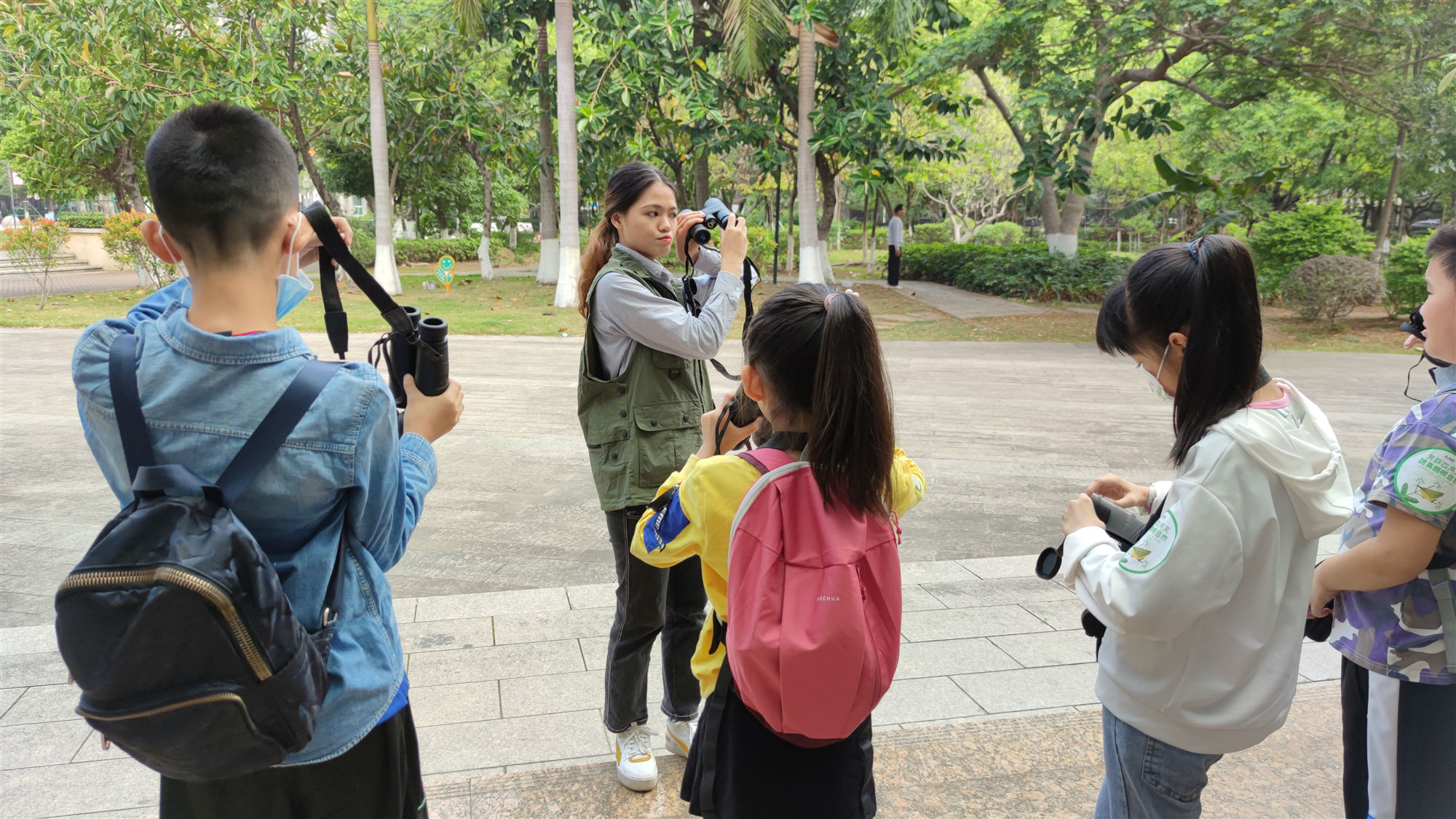早上9点天气不热不燥,正是观鸟的最佳时机。东莞大气环保馆位于黄旗山脚下,树木葱葱非常适合鸟类的生活。在观鸟活动开始之前,自然导师细心教导孩子正确使用望远镜的方法,开启观鸟的第一课。