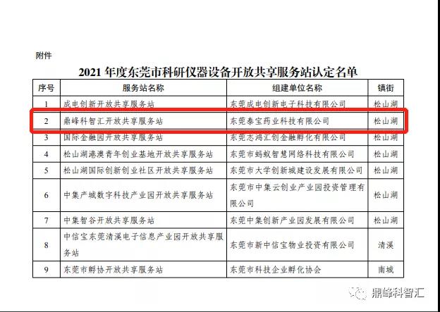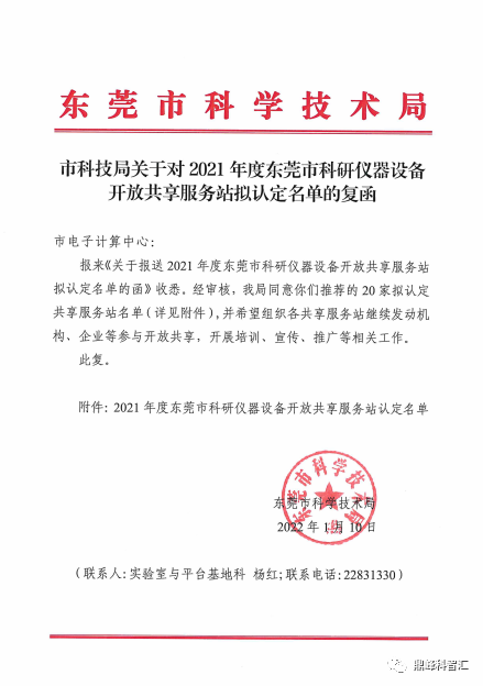 根据《市科技局关于受理科研仪器设备开放共享服务站申请的通知》(东科通〔2021〕51号)的有关规定,经市电子计算中心审核认定,并报市科学技术局备案批复,松山湖鼎峰▪科智汇园区被认定为开放共享服务站。