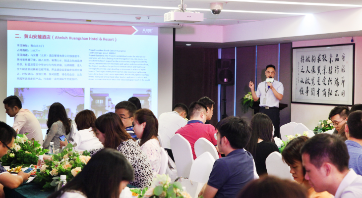 酒店事业部有关人员对酒店版块进行讲解。酒店项目占地总面积约32万㎡,自营品牌松山湖朗卡酒店,以产业园为核心枢纽,运用科技、创新、艺术等手法致力让朗卡品牌在国际精品酒店行业中树立起鼎峰旗帜;黄山安麓酒店,与安麓(北京)酒店管理有限公司合作,将打造成黄山风景区中顶级国际生态度假村;东莞企石钻石半岛度假村项目,依山傍水,风景秀美,致力成为东莞的后花园。